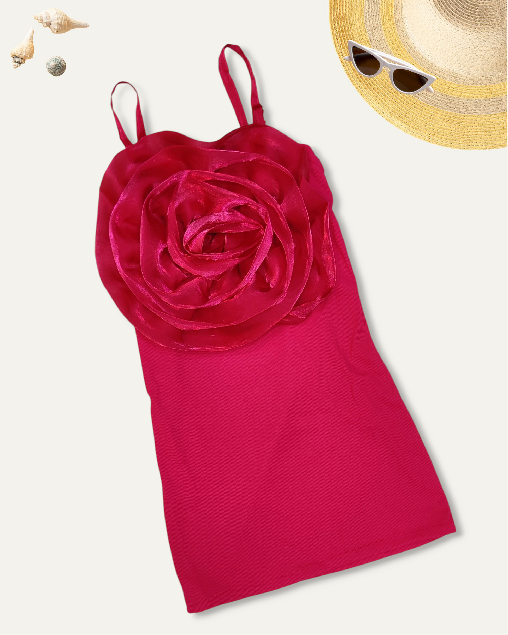 Turn heads with this elegant deep rose-pink dress, adorned with a luxurious 3D floral bloom that sits gracefully on the chest. Designed for girls who love a little extra flair, this sleeveless piece adds charm and drama to any occasion.