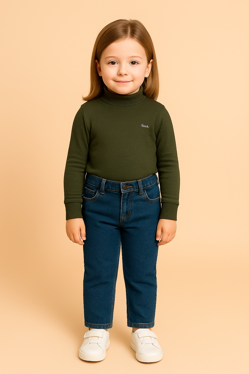 Stay warm and stylish with this olive green high-neck full-sleeve T-shirt for kids. Crafted from soft, breathable cotton, it features a snug fit with ribbed cuffs and a comfortable neckline, perfect for layering in cooler weather. The minimal embroidered text on the chest adds a touch of charm, making it versatile for casual outings or everyday wear.