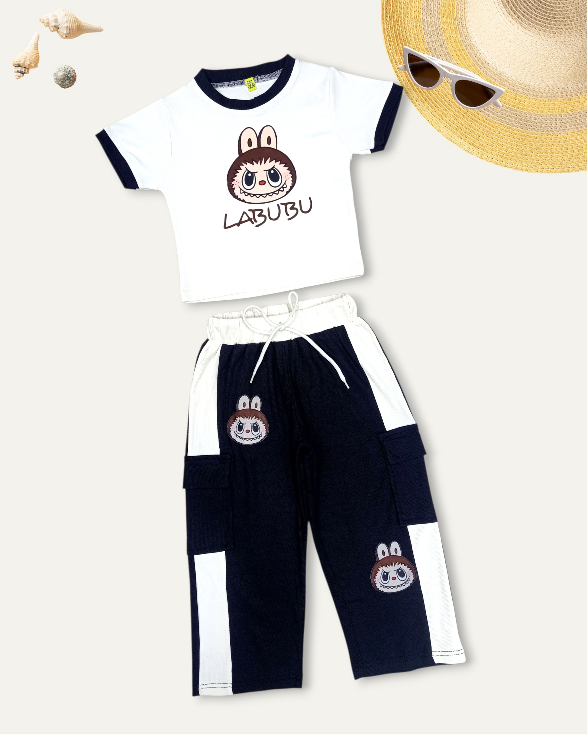 Trendy and playful kids’ co-ord set featuring a cute Labubu print. Made with soft cotton fabric, this stylish black set ensures comfort and fashion for your little one. Perfect for outings, playdates, or everyday wear.