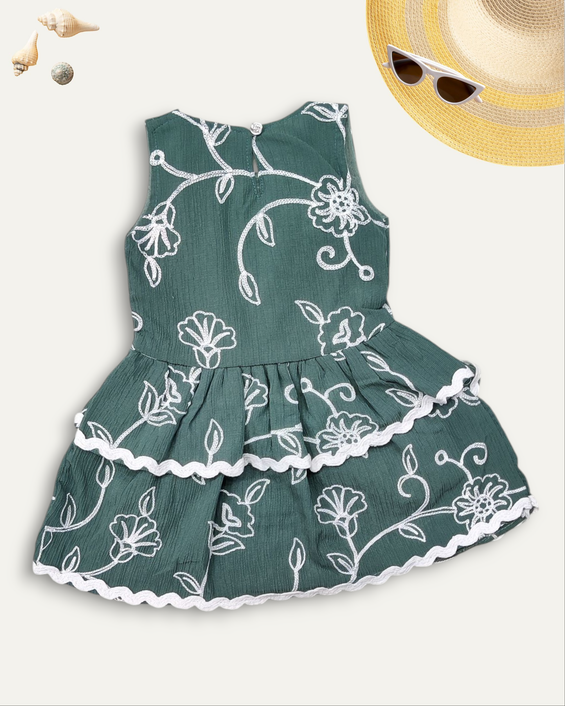 Let your little one shine in this elegant deep green dress adorned with intricate white embroidery and a charming 3D flower. With layered ruffles and soft fabric, itβs a perfect mix of comfort and class.