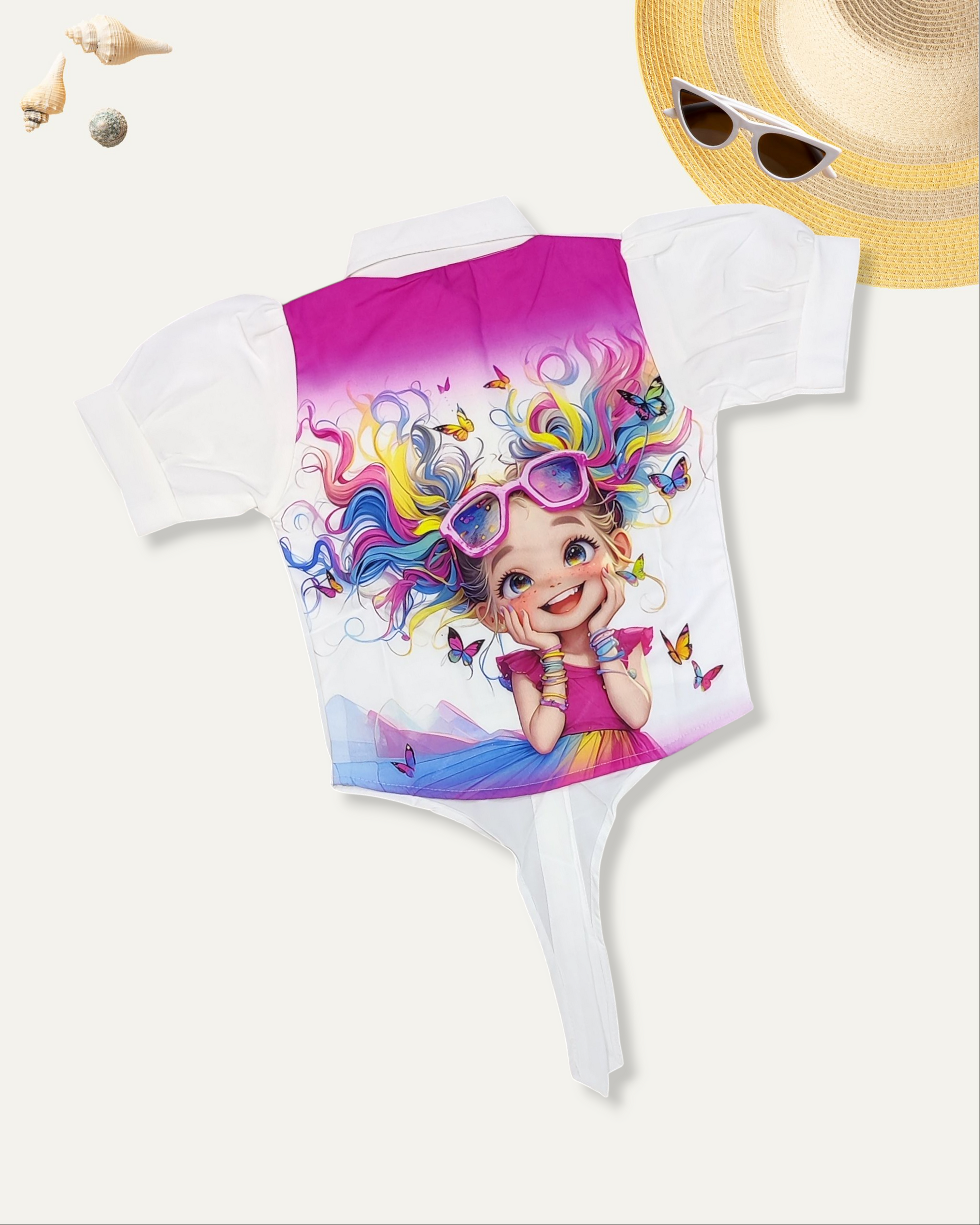 Let your little fashionista step into a world of color and cuteness! This collared shirt features a vibrant, dreamlike back print with rainbow hair and butterflies β made to spark joy and imagination. With its easy button-down front and comfy fit, it's perfect for sunny days and playful vibes.